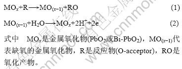 在1987年,YEO和JOHNSON[12]报道掺Bi-PbO2比纯PbO2的析氧反应活性高。析氧反应是指金属氧化物晶格中的氧排出表面,然后通过水在阳极上放电的氧原子来取代。其反应如下[13]: