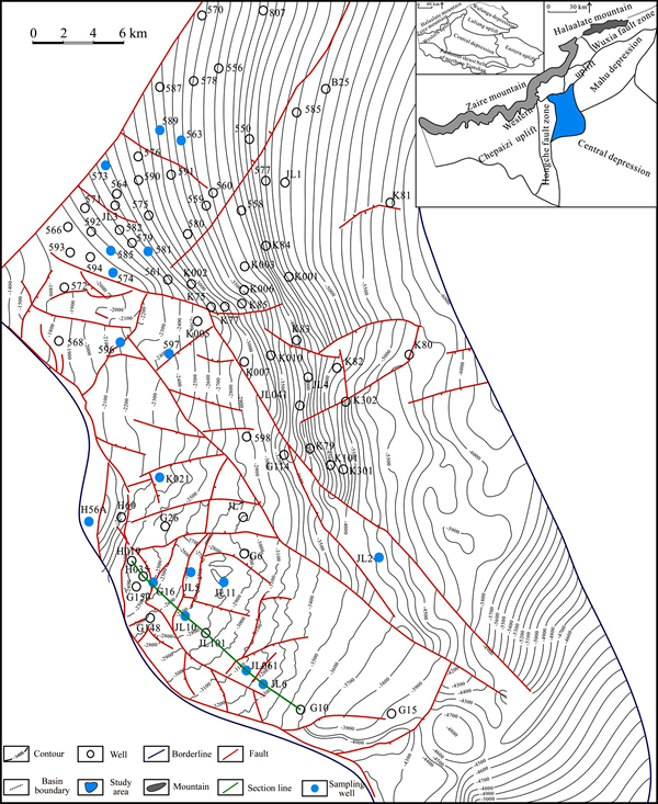The study area is located in the northwestern border of Junggar Basin, about 2200 km2; Primary tectonic unit is located in the western uplift; The northern and western boundaries are Ke-Wu fault zone and Hongche fault zone respectively; the southern and eastern boundaries are Central Depression and Mahu Depression respectively (Figure 1). Ke-Wu fault zone is a N-E alignment thrust fault; Hongche fault zone is a S-N alignment thrust fault. The study area is located in the footwall of thrust fault [15]. There are multiple tectonic movements after Carboniferous volcanic rocks formed, mainly representing that it began to uplift at the middle-late Hercynian tectonic movement, inherited and developed during the period of Indosinian and Yanshanian movement, finally formed during the Himalaya movement, and experienced a entire cycle of tectonic movement from strong to weak till died out. And the influence of Carboniferous tectonic movement is especially important, which is a key period for the whole basin transited from an active basin-mountain system to a more stable basin system [16]. According to drilling and field geological outcrop investigation, the strata of the area are mainly composed of Neogene (N), Paleogene (E), Cretaceous (K), Jurassic (J), Triassic (T), Permian (P) and Carboniferous (C). The thickness of Carboniferous in this area is 1300– 2000 m, and lithology is mainly of intermediate- basic eruptive rocks, some acid eruptive rocks and metamorphic rocks. From Carboniferous to late Jurassic, it was always in the high structural part; The basement exposed to surface for a long-term after Carboniferous volcanic rocks formed, and suffered great weathering-leaching. Therefore, volcanic weathered crust is well developed [17]. Zhongguai high area is a gentle nose-shaped paleohigh formed during the Carboniferous- Early Permian (P1) period; the structural morphology is monoclinal and inclined from NW to SE, with steep south wing and gentle north wing. The top stratum of sedimentary cap of Carboniferous volcanic rocks is thin or partially denuded and wing strata are thick (Figure 1) [18]. There is a serious erosion phenomenon at the bottom strata of Jiamuhe Formation (P1j) in the fault zone and the high structure part; In the late deposition of Jiamu Formation (P1j), the strata of Fengcheng Formation (P1f) and Xiazijie Formation (P2x) were mostly missing, resulting in the erosion of the top Jiamuhe Formation (P1j); During the deposition of lower Wuerhe Formation (P1j), the sedimentary range of Zhongguai high area is extended, Stratigraphic deletion in the upper plate of K-W fault and X-H fault, which made angular unconformity with Triassic Karamay Formation (T2k1). In addition, there is also angular unconformity between the upper Triassic Baijiantan Formation (T3b) and the lower Jurassic Badaowan Formation (J1b), the upper Jurassic Qigu Formation (J3q) and the lower Jurassic Tugulu Formation (K1tg) [19, 20].