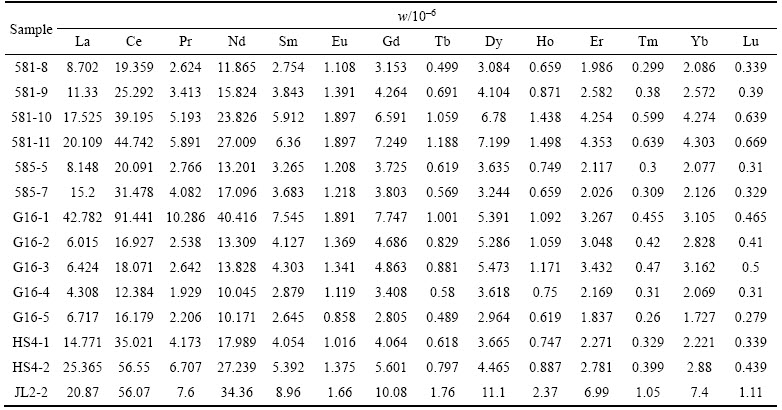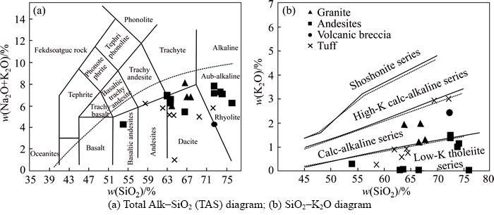 Total Alk–SiO2 (TAS) diagram shows (Figure 3(a)) that the samples are in the subalkalic range; only 1 sample fell in basaltic andesite; 2 samples fell in andesite range vicinity; The remaining samples fell in dacite and rhyolite range. SiO2–K2O diagram shows (Figure 3(b)) that the samples fell in low-potassium tholeiite calc-alkalic series; all of the granite samples fell in calc-alkalic series; most of the remaining samples fell in low-potassium tholeiite series, which have the characteristics of the same term of magmatic evolution; The product (granite) of late magmatic evolution is potassium-rich relatively. Rittmann index δ((Na2O+K2O)2/(SiO2–43))=0.05–2.79; δ value of the 15 samples is less than 1.8, belonging to calc series; δ value of the other 7 samples is in the range of 1.8 to 3.3, belonging to calc-alkalic series.
