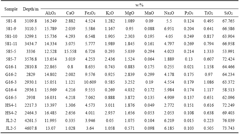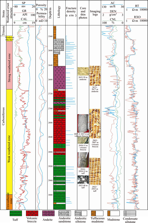 According to the classification results of Carboniferous volcanic weathered crust in Northern Xinjiang by ZOU et al [3], and HOU et al [25], combined with the 1125 m core description of 10 wells (597, 589, 581, JL5, JL6, JL10, JL061, H056A, G6, K021), conventional logging response characteristics of 7 wells, element measurements and physical characteristics of 6 wells in Zhongguai high area. Vertical structure of weathered crust can be divided into weathered clay layer, strong weathered zone, weak weathered zone and unweathered zone (Figure 4). Different weathered crust structures have different characteristics (Table 3). Weathered clay layer is located in the uppermost layer, which is weathered fine residuum; It is affected by lithology, climate, exposure time obviously; Its development degree is different in different tectonic position; Logging response characteristics present low resistivity; Deep-shallow resistivity curve is close to the “box” shape and without any amplitude differences, low density, high acoustic travel time; Detrition is much serious in strong weathered zone; Dissolved pores and structure fractures are much developed; Reservoir spaces are diversified; Porosity and permeability are much better than others; strong weathered zone is the main reservoir space; Porosity and permeability of weak weathered zone decreased sharply compared to strong weathered zone; There is a transition zone at the top of weak weathered zone, but there are still effective reservoirs;Unweathered zone is located at the bottom of weak weathered zone and almost unaffected. Lithology is dense and solid, porosity and permeability are the worst. Through statistics of 1542 porosity samples of different structures from 9 wells, the average porosities of weathered clay layer, strong weathered zone, weak weathered zone and unweathered zone were 3.5%, 13.6%, 7.2%, 4.9%, respectively. Refer to the lower limit of effective porosity (6.4%) in northern Xinjiang [26], strong weathered zone and part of weak weathered zone (the top part and fracture affected area) are effective reservoirs. Formation testing results also proved that effective reservoirs are mainly distributed in strong weathered zone.