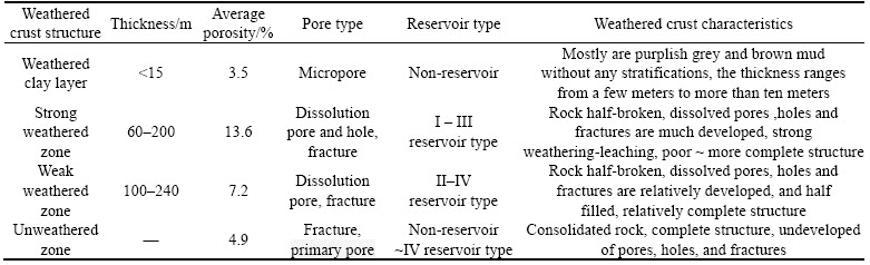 1) Carboniferous volcanic rocks in Zhongguai high area formed in inner continental island arc environment, which are low-potassium tholeiite calc-alkali serie rocks; Volcanic weathered crust structure can be divided into 4 layers: weathered clay layer, strong weathered zone, weak weathered zone and unweathered zone. Physical property of strong weathered zone is the best and the porosity can reach 13.6%.