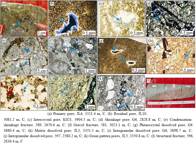 The secondary reservoir spaces mainly include secondary pores and fractures, which are mainly composed of phenocrystal dissolved pores, matrix dissolved pores, intergranular dissolved pores, intragranular dissolved pores and grain pattern pores. Phenocrystal dissolved pores are developed in basalt and andesite, which are formed from the dissolution of feldspar phenocrysts, present honeycomb and sieve porous (Figure 5(g)). Matrix dissolved pores are very common in andesite and basalt of effusive facies, which are the favorable volcanic reservoir spaces and the matrix is composed of hyaline and micritic feldspar; Micritic feldspar can be easily argillation dissolved and then form matrix dissolved pores (Figure 5(h)). Intragranular dissolved pores are distributed in andesite of effusive facies, volcanic breccias and tuff of eruptive facies, irregularly in shape and often in an embayed shape (Figure 5(i)), which are formed from tuff, volcanic breccia and volcanic crystal after the dissolution diagenesis. Intergranular dissolved pores are developed in andesite and volcanic breccia, which are mainly formed from intergranular matrix after leaching of atmospheric water or fresh water; The shape is elongated or tuberose, and pore diameter is 0.15–0.5 mm (Figure 5(j)). Grain pattern pores are distributed in volcanoclastic rocks, mainly are feldspar moldic pores, which are the original components of dissolved volcanic rock but still retain the original appearance of the components (Figure 5(k)). The secondary fractures include structural fractures, weathered fractures and dissolved fractures. Structural fractures are formed under the tectonic stress in the later stage, surface smooth, attitude stable, extended farther, and have obvious directivities (Figure 5(l)), which are the main fracture type in this area and have an important effect on improving the reservoir seepage ability. Weathered fractures are mainly developed near the unconformity surface. Weathering-leaching caused the shape extremely irregular, extended shorter, often half filled or filled with mauve ferruginous or argilaceous, which made few contributions to oil and gas accumulation.