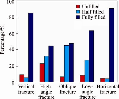 Other types are less developed and reservoir stimulation is limited; structural fracture is mainly controlled by fault [31]. Horizontal permeability is the main factor of well production; According to the fracture attitude, seepage abilities from high to low are reticulatus fracture, oblique fracture, horizontal fracture and vertical fracture. Different types of fractures crisscross formed reticulatus fractures in the area, which have an important effect on improving reservoir seepage ability [32]. According to the fracture angle, it can be divided into horizontal fracture (less than 10°), low angle fracture (10°–30°), oblique fracture (30°–60°), high angle fracture (60°–80°), vertical fracture (more than 80°), low angle fracture and oblique fracture extended farther, and mostly in the form of reticulatus fractures in the area. The statistics of fracture filling degree in this area shows that filling degree of vertical fracture and horizontal fracture is the highest and about 90% is fully or half filled. Followed by low angle fracture, more than 80% is fully or half filled. High angle fracture and oblique fracture are relatively lower and about 60% is not filled or half filled (Figure 7).