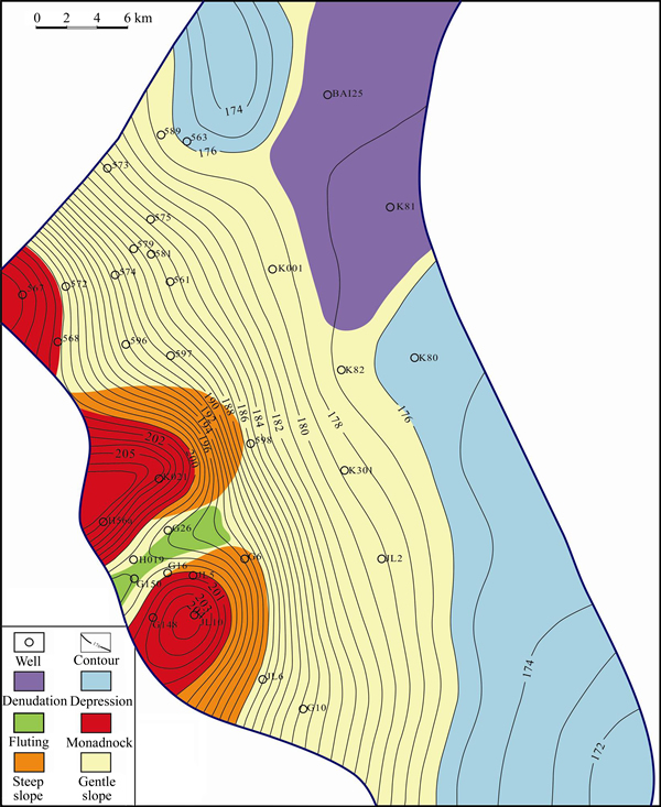 The palaeogeomorphology is the result of combined effects of weathered crust karstification and various geological processes. Different palaeogeomorphologies play different controlling role on weathering-leaching, and also affect the distribution of reservoirs [33, 34]. According to tectonic evolution, Carboniferous palaeostructure and volcanic facies model in the study area, palaeogeomorphology can be divided into monadnock, gentle slope, steep slope, denudation, depression and fluting unit (Figure 9). Monadnock unit is located in the high part of paleogeomorphology, near the main fault. Weathering-leaching is the strongest, fracture is more developed relatively and provided favorable conditions for weathering-leaching and groundwater denudation, which is conducive to the forming of effective reservoirs. For example, formation testing of well K021, JL10 and H019 is 66.38 t/d, 20.16 t/d and 105.96 t/d, respectively. Gentle slope unit is located in the relatively high part of paleogeomorphology, near the gentle slope zone of the fault and weathering-leaching and denudation is strong. For example, formation testing of well 574, JL6 is 14.66 t/d and 5.3 t/d respectively, which is slightly worse than that of monadnock. Steep slope unit is located in the relatively lower altitude part of paleogeomorphology and weathering-leaching degree is weak; However, some still can form favorable reservoirs (formation testing of well G6 is 5.2 m3/d). Denudation, depression and fluting unit are in the lowest position, weathering-leaching degree is weak and it is difficult to form effective reservoir.
