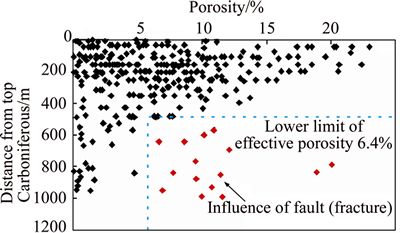 Through the statistical relationship about 1542 porosity samples of 9 wells (597, 589, 581, JL6, JL10, JL061, H056A, G6, K021) and the distance to the top of weathered crust (Figure 10), the samples with porosity greater than 15% are located within 240 m under weathered surface, and 6% to 15% are mainly distributed in the range of 240 to 480 m. With the distance to the top Carboniferous increasing, the porosity decreased sharply. Within 480 m of the top weathered crust, it can form effective reservoir (within 240 m is the best) and the maximum porosity can reach 23.1%. Because of the fault (fracture), surface water along with fault infiltrate and dissolute reservoir, porosity can reach 20.7% and the distance to the top weathered crust of effective reservoir can be extended to 1000 m.