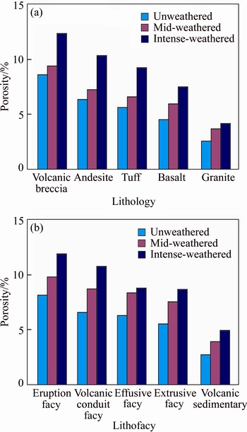 Figure 12 Average porosities of volcanic rocks of different lithologies (a), lithofacies (b) for weathered degrees