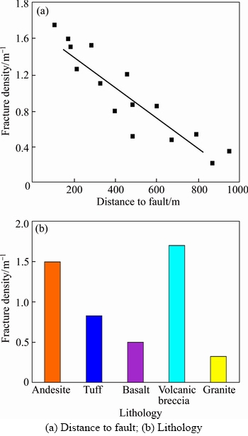 Through statistics of the relationship between fracture density and the distance to main controlling fault, high fracture density mainly located in the main controlling fault within about 500 m. The closer the distance is, the more the fractures developed. Beyond 500 m from the main controlling fault, the fracture density decreased obviously (Figure 13(a)). Moreover, there is a direct relationship between volcanic lithology and fracture development [38]. Fracture density of volcanic breccia, andesite, tuff, basalt and granite are 1.7 m–1, 1.5 m–1, 0.8 m–1, 0.5 m–1, 0.3 m–1 respectively. The maximum fracture density is volcanic breccia and andesite, which has a direct relationship with rock mechanic strength decreasing due to a long-term weathering-leaching(Figure 13(b)).