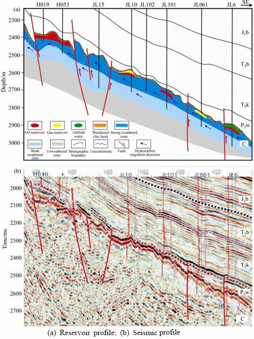 Oil and gas are closely related to the weathering-leaching of unconformity surface. The formation testing results of well 573, 563, 574, H019, H56A, K021 and JL10 are favorable, and testing depths are all near the top of weathered crust, and basically located in strong weathered zone. Thus, weathering-leaching has an important effect on reservoir reconstruction, migration and accumulation of oil and gas. Statistical analysis shows that the distribution of favorable reservoirs is mainly controlled by the distance to the top weathered crust, ranging from 20 to 240 m. High production wells are enriched where it is the favorable reservoir development zone. Oil and gas are mostly enriched in the range of 20–130 m (Figure 11).