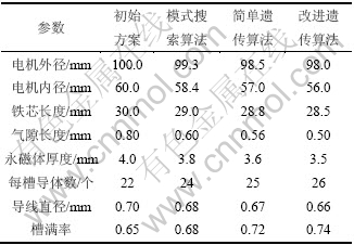 由于模式搜索法的优化效果与其所依赖的算法的初始解的收敛性密切相关,且对电机方案的优劣判断仅通过单个优化变量的数值增减而不是综合考虑多个优化变量数值的变化来决定,因此,模式搜索法难以实现全局最优解。若利用简单遗传算法,则得到初始解等,再应用模式搜索法,优化效果会更佳。