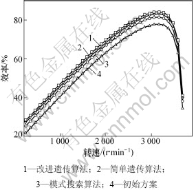 初始方案与各种算法的电机效率与转速的关系曲线变化图,如图2所示。