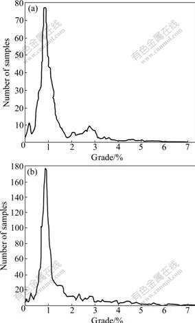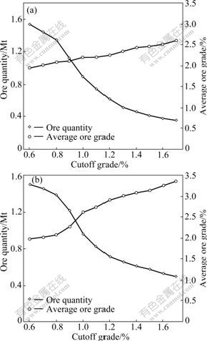 Fig.3 Grade-tonnage relationship for unit 2 (a) and unit 6 (b)
