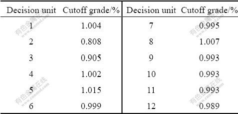By applying the developed optimization algorithm, the resulting optimum cutoff grades were obtained for the 12 decision units as shown in Table 1.