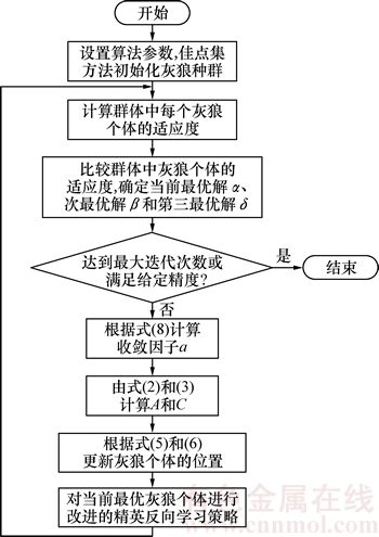 1) 利用佳点集方法产生初始狼群个体,采用对数函数描述收敛因子以平衡灰狼算法的探索和开发能力,对当前最好的3个灰狼个体执行改进的精英反向学习策略产生反向精英个体,以避免算法出现早熟收敛。