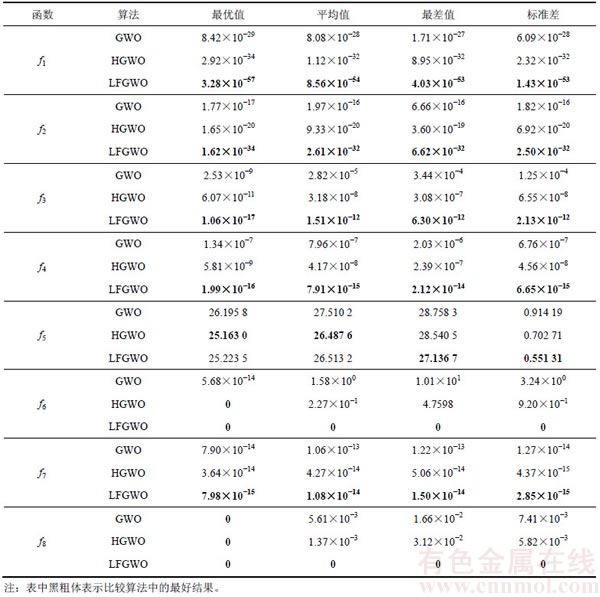 为了验证本文提出的基于对数函数的改进灰狼优化算法(记为LFGWO)的有效性,从文献[7]中选取8个国际上通用的标准测试函数进行数值实验,8个测试函数的函数名、具体表达式、搜索区间以及收敛精度如表1所示。在8个标准测试函数中,f1~f5为复杂单峰函数,f6~f8为复杂多峰函数,8个测试函数的维数均设置为30,8个函数的理论全局最优值均为0。