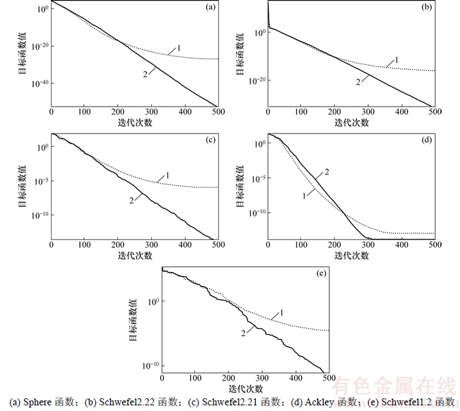 图2所示为基本GWO算法和LFGWO算法对5个函数的寻优收敛曲线。从图2可以看出:与基本GWO算法相比,LFGWO算法具有更快的收敛速度和更高的收敛精度。