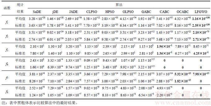 为了进一步说明LFGWO算法的有效性,将其与文献[1]中的9种改进群体智能优化算法进行比较,这9种算法为:SADE,jDE,JADE,CLPSO,HPSO,OLPSO,GABC,CABC和OCABC。为了比较的公平性,LFGWO算法的最大适应度计算次数设置为50 000次;SADE、jDE和JADE 3种算法的对每个函数设置了不同的适应度计算次数,最少为50 000次,最多为300 000次;CLPSO,HPSO和OCPSO这3种算法的适应度计算次数均设置为150 000次;GABC,CABC和OCABC 3种算法的适应度计算次数均设置为200 000次。LFGWO算法与其他9种算法对6个测试函数(f1,f2,f5,f6,f7,f8)的寻优结果比较如表3所示。为了增加可信度,其他9种算法的结果直接来源于文献[1]。