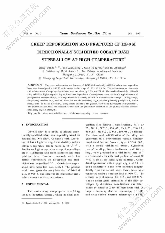 Key words:directional solidification, cobalt-base superalloy, creep ,fracture