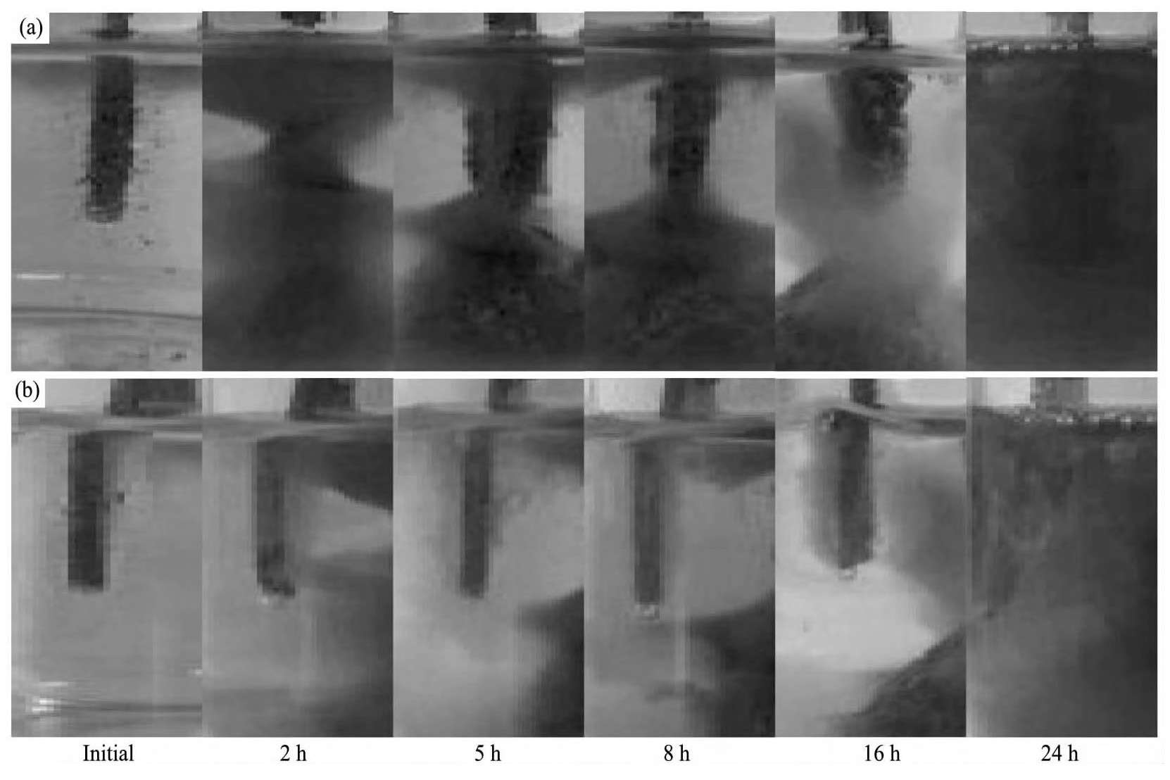 图4为电吸附不同时间时阴阳极表面的实验现象。刚通电以后,阳极附近迅速出现红色沉淀,悬浮于溶液中,此时阴极表面出现大量气泡,周围的溶液澄清。2 h后阳极附近出现大量的红色沉淀,悬浮于溶液中,此时阴极表面气泡减少,周围有白色絮状物出现。5 h以后,阳极周围的红色絮状物迅速下沉,附近的溶液变得澄清。16 h以后阳极附近出现白色絮状物,此时阴极表面仍然有气泡产生,同时开始有少量白色沉淀出现。24 h以后,阳极仍然有气泡产生,但此时沉淀反应越来越少,溶液变得浑浊呈蓝黑色,而阴极表面仍然有气泡和少量白色沉淀出现。
