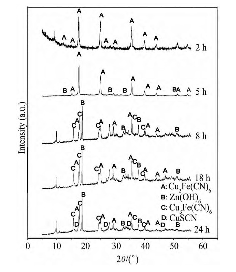 由图6的分析结果可以看出,2 h时出现的沉淀物主要为Cu2Fe(CN)6,5 h以后,开始有Zn(OH)2与Cu3Fe(CN)6·4H2O沉淀出现,16 h以后才有Cu SCN沉淀出现。由于沉淀并未出现于极板表面,而是主要集中在靠近阳极的区域,因此这可能是由于溶液中阴离子在外加电场的作用下发生定向移动后,使得阳极表面附近的离子浓度逐渐增大,各种离子的迁移速度不同,导致形成不同沉淀的时间有所差异。