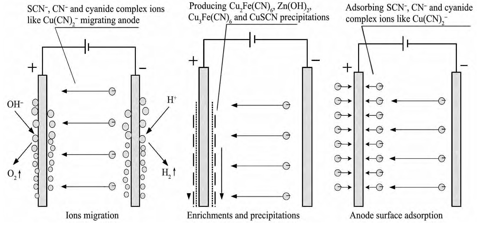 另外,由于阳极为多孔的煤基材料,具有较大的比表面积和良好的吸附性能,溶液中的游离氰根CN-,SCN-,Cu(CN)43-或Cu(CN)32-,Fe(CN)64-或Fe(CN)63-,Zn(CN)42-定向移动后一部分会吸附于阳极表面。