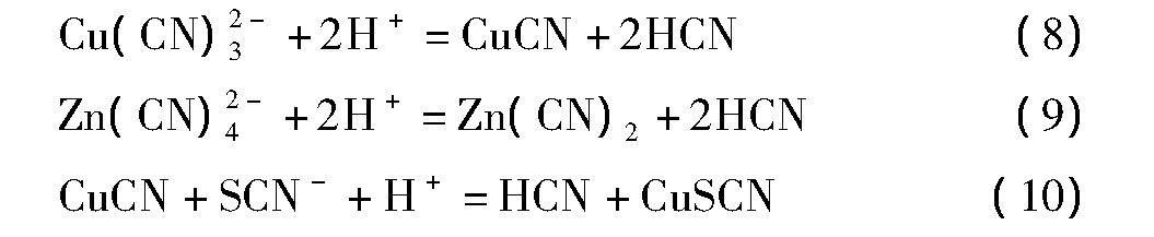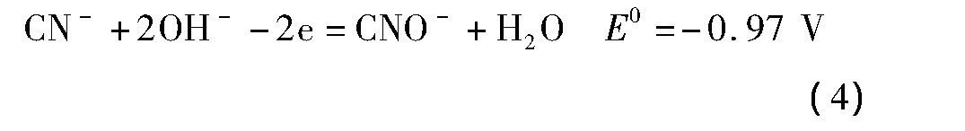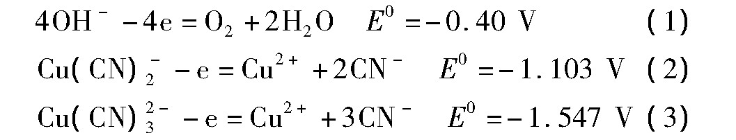 首先,在直流电场的作用下,溶液中的SCN-,Cu(CN)43-或Cu(CN)32-,Fe(CN)64-或Fe(CN)63-,Zn(CN)42-等阴离子产生定向运动,逐渐向阳极迁移。在阳极上,由于Cu(CN)2-/Cu2+,CN-/CNO-,CNO-/CO2,N2的标准电位(E0)比OH-/H2的标准电位更负,此时阳极反应主要以析出氧气为主,同时可能存在少量CN-的氧化及Cu(CN)2-的氧化反应。