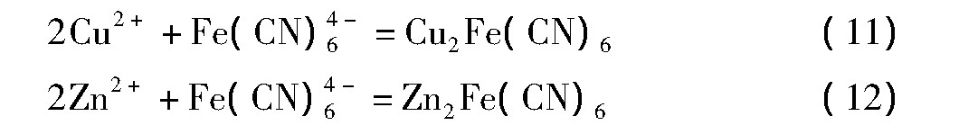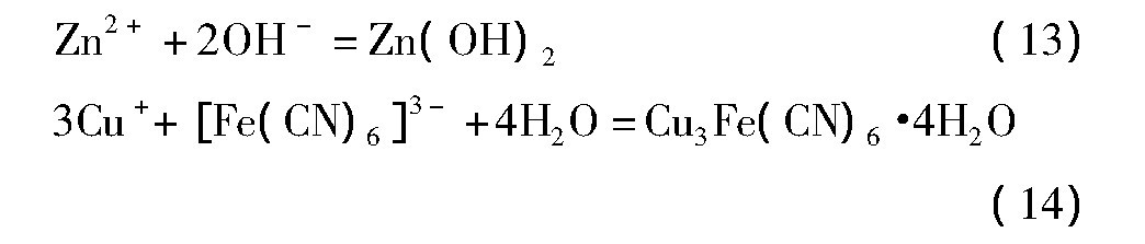 同时,由于离子的定向移动及阳极反应,阳极附近的铜氰、锌氰络离子发生氧化反应分别释放出Cu+/Cu2+及Zn2+。这些离子与溶液中的铁氰络离子会发生沉淀反应,生成亚铁氰化铜、亚铁氰化锌以及铁氰化亚铜,同时也有部分氢氧化锌沉淀。