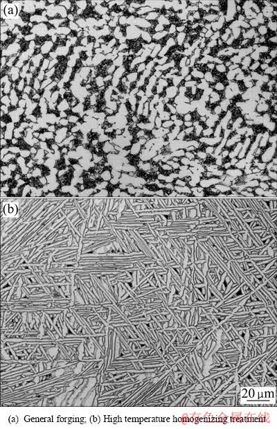 与常规锻造相比,高温均匀化处理可以使晶体缺陷均匀化和过饱和固溶体均匀分布,达到组织均匀化、特别是晶粒均匀化的目的。经高温均匀化处理后,锻态组织为三态组织(即αe+αs+βt组织),其特征为αe的体积分数为10%,αs的体积分数为70%,且条状αs混乱交织。冷却速度越大,过冷度越大,条状αs晶粒越细,编织程度越混乱。水冷的目的就是获得过饱和马氏体,避免在β相区锻造得到魏氏组织而不利于其后两相区大变形量锻造时获得等轴细晶[7]。对经高温均匀化处理和常规锻造的样品进行XRD分析,结果如图2所示。由图2可见,经高温均匀化+水冷处理后的试样存在相当数量的α′相;而常规锻造式样中的α′相含量很少,主要相组成为稳定的α相和β相。