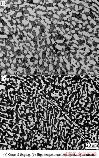 不同锻造方式表现出的差别很容易从微观组织形貌上得到解释,由于高温均匀化锻造得到的是网篮组织,α相具有较高的纵横比,提供了更大的α/β相界面,所以具有较高的强度,而较为均匀细化的组织结构同时保证了材料的塑性。