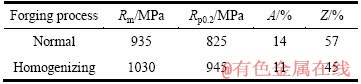 对前面经过不同锻造工艺处理的试样进行锻态力学性能测试,结果见表2。由表2可以看出,高温均匀化锻造时,其强度指标较之常规锻造的有显著提高,而其塑性指标下降并不明显。