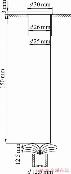 实验材料采用高纯铝、纯镁、纯锌、Al-50Cu、Al-4Zr、Al-2Sc、Al-5Cr及Al-5Ti-1B中间合金为原料,经过750~780 ℃熔炼,在铸铁模里进行浇注得到直径为118 mm的圆铸锭;运用SPECTROLAB/MAXx测得合金成分为Al-7.01Zn-1.39Mg-2.25Cu-0.07Zr- 0.07Sc-0.06Cr-0.06Ti-0.08Fe-0.06Si(质量分数,%)。对所得铸锭进行(350 ℃,6 h)+(470 ℃,16 h)均匀化退火;将退火后的铸锭进行挤压变形加工处理,挤压比为20.3:1,得到直径为30 mm的圆棒;然后加工成直径为25 mm,长度为160 mm的棒材作为末端淬火试样,并在端淬试样距离端部5、15、30、50、100、150 mm处埋入K型压簧式热电偶。