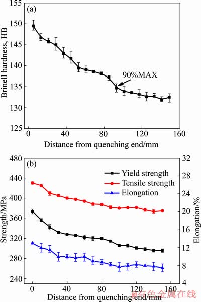 Fig. 3 Brinell hardness(a) and strength(b) at different positions from quenching end after aging treatments