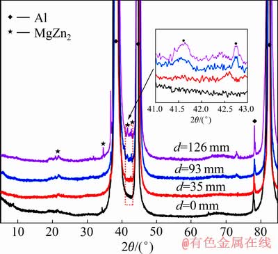 图4所示为端淬试样进行固溶-端淬-时效处理后取不同位置测得的XRD谱。由图4可知,合金在固溶时效后主要生成的第二相为MgZn2。当距离淬火端0 mm时,MgZn2的衍射峰为一个小鼓包,MgZn2含量较少,查阅文献[15]可知,此时合金中,MgZn2的主要存在形式为η′过渡相。当距离淬火端为35 mm时合金的MgZn2的衍射峰的峰强增强,随着与淬火端距离增长到93 mm和126 mm时,MgZn2的衍射峰更为明显,但二者的变化较小。这说明距离淬火端越远,合金析出的MgZn2平衡相的量会增加,但逐渐会达到最高值。