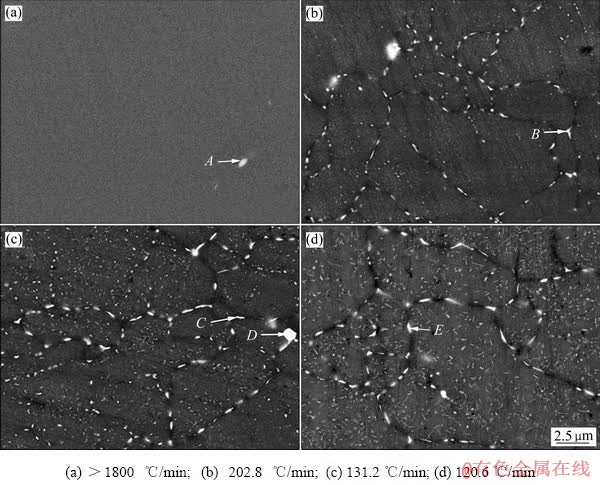 图5 不同冷却速率端淬态样品SEM的背散射电子分析照片