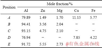 距端淬态试样端部不同距离位置处不同冷却速度的背散射电子图像如图5所示。并对其中A、B、C、D点进行EDS分析,其分析结果如表1所示。从图5(a)中可以看出,当冷却速率v大于1800 ℃/min时,除了小部分白色初生相外,没有明显粗大的析出相。当d=35 mm,v=202.8 ℃/min时,在晶界处出现与初生相相比较为细小的的第二相,如图5(b)所示。随着离淬火端距离变远冷却速率降低,当d=93 mm,v=131.2 ℃/min时,晶界处析出的第二相变大,同时,在晶内处也析出了尺寸较为细小的第二相,当d=126 mm,v=120.6 ℃/min时,晶粒内部析出的第二相也变得更明显,如图5(c)~(d)所示。由EDS分析可知,初生相主要为铁铜杂质相(A、D点);晶界第二相主要包含Al、Zn、Mg 3种元素(B、C、E点)所示。由此可见,晶界析出的为MgZn2相与XRD结果相对应。