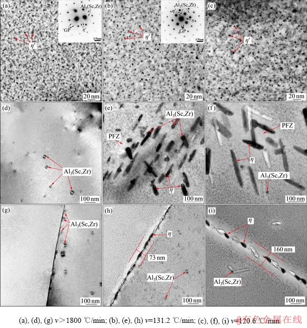 增大,从而导致时效析出η′相逐渐减少,但GP区仍存在,如图7(a)~(c)所示;由图7(a)电子衍射花样可以看出,此时时效态样品中MgZn2的主要存在形式为η′强化相;在端淬过程中析出的粗大MgZn2会在时效过程中作为异质形核核心,吸收周边的溶质,继续长大同时出现PFZ区,如图7(d)~(f)所示,随着冷却速率减小,粒子长大,导致PFZ会变宽,其中晶界上的PFZ从30 nm宽化至160 nm,如图7(g)~(i)所示。