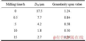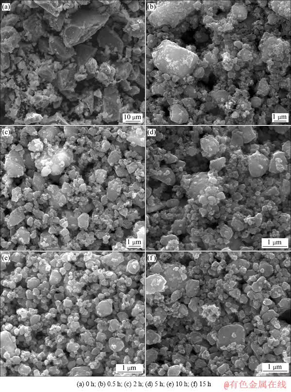图1所示为原料粉末及球料比为20:1时分别经0.5、2、5、10和15 h球磨后TiH2粉末的SEM像。从图1中可以看出,原料为不规则的多角形,粒度分布较广。与原料相比,球磨0.5 h后粉末的形貌虽然基本上仍保持不规则多角形,但棱角已经明显钝化,粉体粒度明显细化,但粉末的粒径差仍十分明显;球磨2 h后,不仅粉体的平均粒度迅速减小,而且粒径的均匀性大大改善。随着球磨时间的延长,TiH2粉体的D50逐步减小到亚微米级,粒度分布的范围也越来越集中;但是,球磨超过10 h后,粉末粒径差异又再次变大。表2所列为在激光粒度分布仪上测得的经不同时间球磨后粉体的D50和