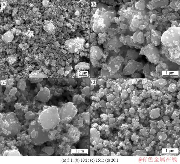 图2所示为当球磨时间为10 h时采用不同球料比获得的TiH2粉末的SEM形貌。由图2可见,球料比对粉末粒径及其均匀性具有重要影响。当球料比为5:1时,所获得的球磨粉末的粒度均匀性很差,大颗粒粉末粒径仍大于5 μm;当球料比为10:1和15:1时,球磨粉末的粒径大部分依旧大于1 μm,均匀性仍然较差;只有当球料比为20:1时,球磨粉末粒径完全达到亚微米级,且均匀性良好。