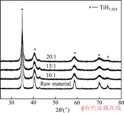 Fig. 4 XRD patterns of TiH2 powder after milling for 10 h at different mass ratios of ball to powder