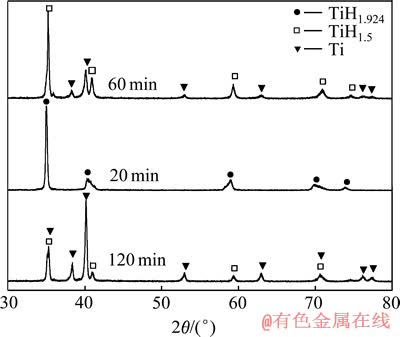 BHOSLE[11]用TEM原位观察了TiH2粉在真空环境下加热分解过程中的相变,得出TiH2脱氢分两步完成:第一步TiH2→TiHx(0.7<x<1.1);第二步TiHx→Ti,即在升温过程中,TiH2首先部分发生脱氢,生成TiHx,TiHx是一种六方结构的亚稳相,在高温下比TiH2更稳定;随着温度的不断升高,TiHx继续脱氢,最终转变成具有密排六方结构的α-Ti。KENNEDY[12]用XRD方法研究了TiH2在氩气氛中加热脱氢的相变过程,认为TiH2的分解过程为TiH2→TiH1.5→Ti。本文作者所在课题组通过水淬与XRD相结合的方法研究了TiH2在氩气氛中的脱氢规律,得到与文献[12]相似的研究结论:TiH2→TiH1.5→α-Ti(H固溶)→α-Ti[9]。将TiH2粉在真空环境下以450 ℃分别保温20、60和120 min后,用XRD检测其成分,结果见图5。从图5中可以看到:保温20 min后,TiH2基本未发生分解,这可能是由于真空炉管传热较慢,短时间内TiH2还没未达到脱氢温度。保温60 min后,TiH2已经全部转变为TiH1.5,且部分TiH1.5已经转变为Ti,未发现其他明显的TiHx相产生。保温120 min后,TiH2几乎全部转变为Ti,只剩少量的TiH1.5。由此可以得出,TiH2在真空中的分解过程亦为TiH2→TiH1.5→Ti。