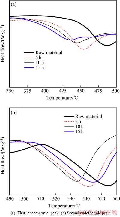 对球料比为20:1条件下经过不同时间球磨获得的TiH2粉末进行DSC分析,图6为所获得的测试结果。由图6可见,在DSC曲线上出现了两个明显的吸热峰。由于分析条件与文献[9]的基本相同,因此,可认为DSC曲线上左边的第一个吸热峰对应TiH2→TiH1.5转变,而第二个吸热峰对应TiH1.5→Ti转变。