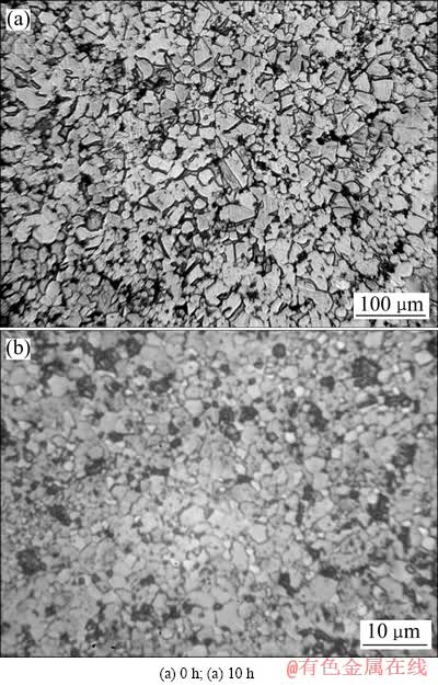 选取以上确定的最佳球磨工艺参数制备球磨TiH2粉末,经压制成形和脱脂后,最后按照1 050 ℃、3 h烧结工艺进行真空烧结。烧结坯样收缩均匀,表面呈银白色金属光泽,无肉眼可见缺陷,收缩率为24.4%,孔隙度较低,密度为4.508,烧结密度与理论密度几乎一致。经分析,烧结后的坯样含0.11% Fe,这应该是磨球对粉末产生的污染。图8所示为原料粉末与球磨粉末烧结样品的显微组织。其中,原料粉末的烧结工艺为1 250 ℃、3 h。由图8可知,原料粉末烧结样品的显微组织为粗大的等轴晶,平均晶粒尺寸约为40 μm。而球磨粉末烧结样品的显微组织十分均匀,晶粒尺寸均已经降至5 μm以下,达到了超细晶材料的晶粒度要求。