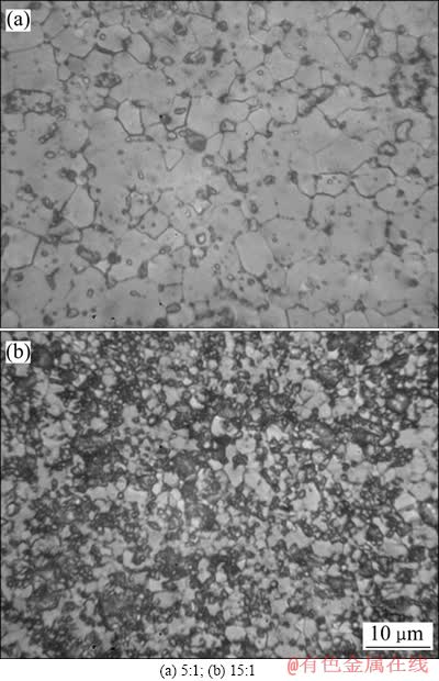 图9所示为在除球料比变化外其他球磨条件与上面相同时获得的球磨粉末烧结样品的显微组织。由图9可见,球料比对显微组织的演变有显著影响,随着球料比的增加,晶粒细化的效果与晶粒尺寸的均匀性均得到了改善。