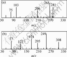 对2种配合物进行GC-MS分析,观察它们的气相色谱,在飞行时间为0~18 min时,CLN-TCZ和4-DTA-CLN-TCZ分别仅在保留时间为3 min和3.7 min左右有1个峰,表明所合成的配合物样品为纯物质。分别在3 min和3.7 min进行MS谱分析(见图1),它的主要碎片离子峰数据如表3和表4所示。