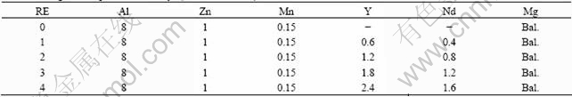 AZ81(A) alloy, metallic aluminum (99.98%), metallic zinc (99.97%), Mg-Y master alloy and Mg-Nd master alloy were used as raw materials. The studied alloy was designed as Mg-8.0Al-0.75Zn-0.15Mn-xRE, where x is the total content of rare-earth elements, x=0, 1, 2, 3, 4 respectively. The mass ratio of Y to Nd is 3?2. The designed compositions of the alloys are listed in Table 1.