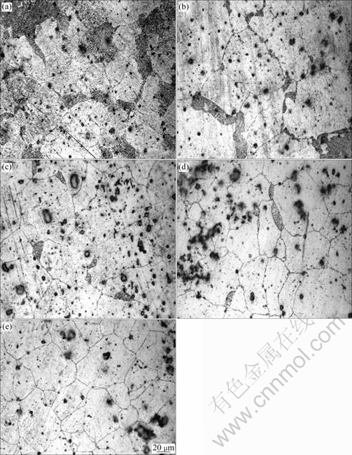 Fig.1 Microstructures of AZ81+RE alloys after solid solution and aging treatment: (a) AZ81; (b) AZ81+1%RE; (c) AZ81+2%RE; (d) AZ81+ 3%RE; (e) AZ81+4%RE