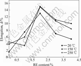 2) After solid solution and aging treatment, with increasing the content of RE elements, the tensile strength and elongation of the alloys are both (at room temperature, 150 ℃ and 250 ℃) increase first, then decrease basically.
