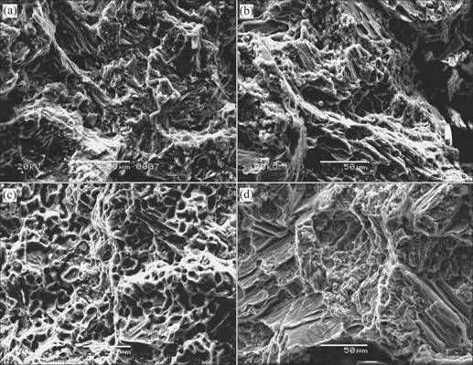 Fig.6 SEM fractographs for AZ81+RE alloys at room temperature: (a) AZ81; (b) AZ81+1%RE; (c) AZ81+2%RE; (d) AZ81+3%RE