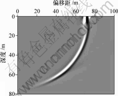 图5所示为采用PML吸收边界条件时的瑞雷波波场快照。可见,加了PML吸收边界以后,由于该边界条件很好地消除了周期折叠效应,大大削弱了人工边界的反射,反射的横波、面波及纵波几乎全部被吸收,使得所要计算的波场特征变得非常清晰,横波和瑞雷波清楚地显示在波形记录上。经计算,PML吸收边界条件的吸收率(吸收能量与未吸收能量之比)为99.99%,可见,使用PML,可以使FDTD模拟的最大动态范围达到80 dB。