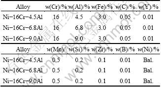 Three Ni–16Cr–xAl based alloys containing different aluminum contents of 4.5%, 6.8% and 9.0% were prepared using high-purity materials (99.99%) by arc melting in a vacuum furnace. The nominal compositions of the alloys are shown in Table 1. The as-cast alloys were cut into cylindrical specimens of 8 mm in diameter and 7 mm in height. The surfaces of the specimens were polished with SiC papers down to 2000 grit, cleaned sequentially in alcohol and distilled water in an ultrasonic bath, and then dried in hot air. Pre-oxidation treatment was conducted in the mixture of nitrogen (with the flow rate of 0.03 m3/h) and air at 1 000 ℃ for 50 h, followed by air cooling. The as-cast and pre-oxidized specimens were then put into the Al2O3 crucibles, immersed completely in the mixed Na2SO4–25%NaCl salts, and placed in a tube resistance furnace. The corrosion tests were conducted at 600 ℃ in air for 25, 50, 75, and 100 h, respectively. After the tests, the samples were washed with boiling distilled water to dissolve the remains of Na2SO4–NaCl, and to remove the loose corrosion products with hydrochloric acid. The morphology and compositions of the surface for the corroded specimens were investigated by field emission scanning electron microscope (FE-SEM, Nova Nanosem 230) equipped with an energy dispersive spectroscope (EDS). The phase compositions of the corroded scales were determined by X-ray diffraction (XRD, Rigaku, D/max-2550VB). Both of the specimens before and after corrosion tests were measured using an electronic balance with an accuracy of 0.1 mg.