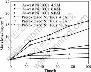Fig. 1 Mass change per unit area of pre-oxidized and as-cast specimens as function of time in Na2SO4–25% NaCl salts at 600 ℃